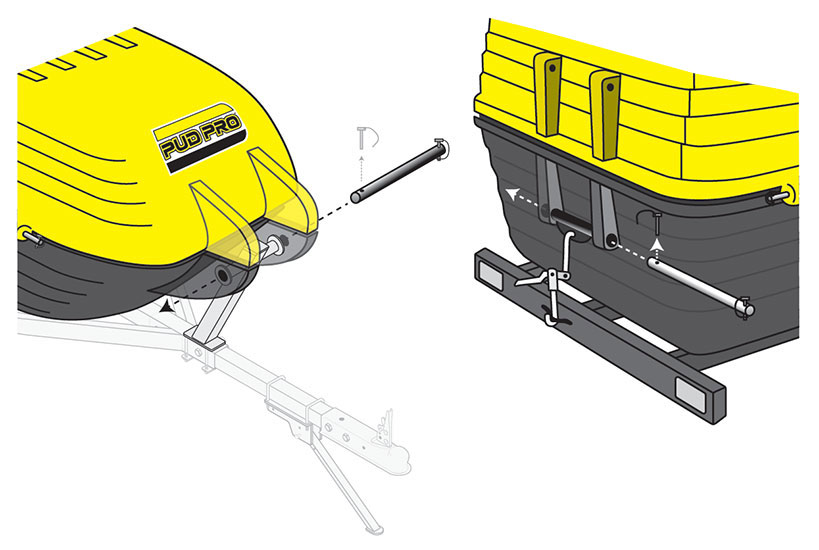 Remove two pins and the Pud Pro™ is easily separated from the trailer. The Snowmobile harness is connected with one pin. Remove the hinge pin and separate the two haves to double your sled towing capacity by linking the two halves together, or use the two halves as small boats.